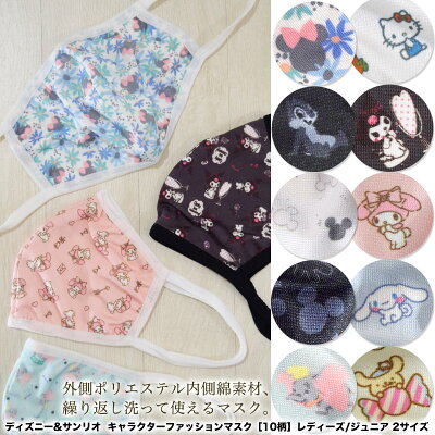 [送料80円~]ディズニー&サンリオ キャラクターファッションマスク[10柄】レディーズ/ジュニア 2サイズマスク キャラクター ディズニー ミニー クロミちゃん レディース ジュニア キッズ 子供 洗えるマスク 立体マスク 水着素材 綿 ガーゼ