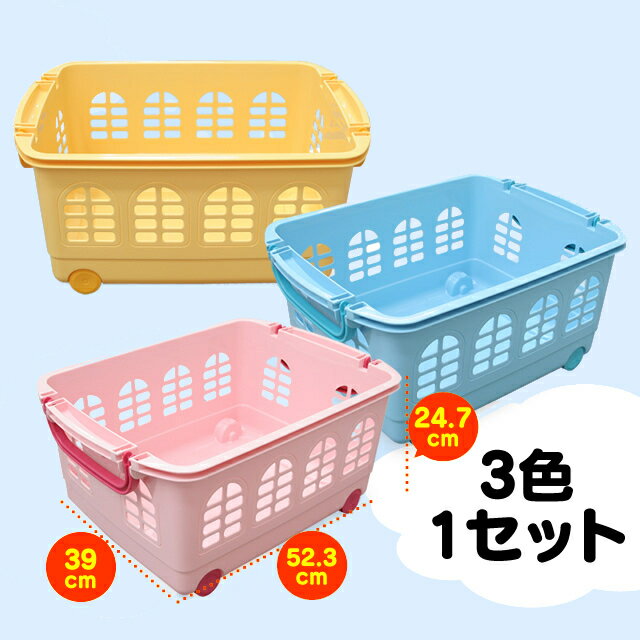 ◆商品サイズ(cm):幅約39×奥行約53.2×高さ約24.7(3段積み重ね時 約74.1cm)◆商品内寸(cm):幅約27×奥行約41.5×高さ約22.5(1つ当たり)◆耐荷重:5kg(1つ当たり)◆主要材質:ポリプロピレン◆カラー:ペールイエロー・ペールブルー・ペールピンク*バスケットのお色は写真通りとなりお選びいただけません。